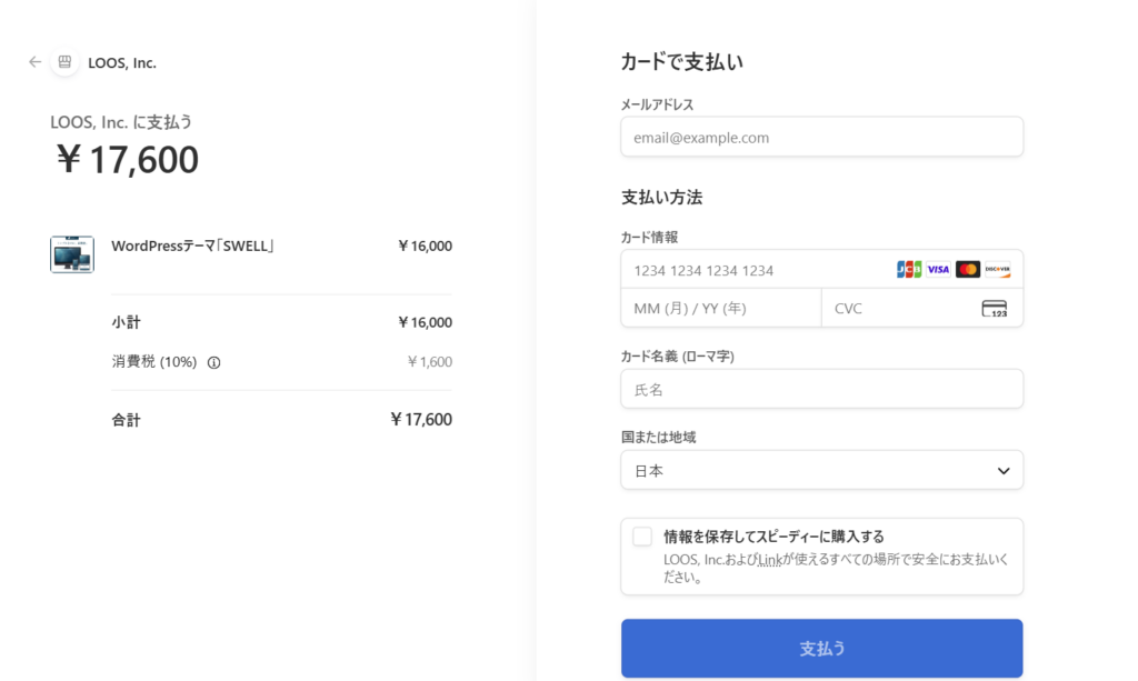 『カードで支払い』『支払い方法』を入力して『支払う』をクリックしたらSWELLテーマの購入が完了となります