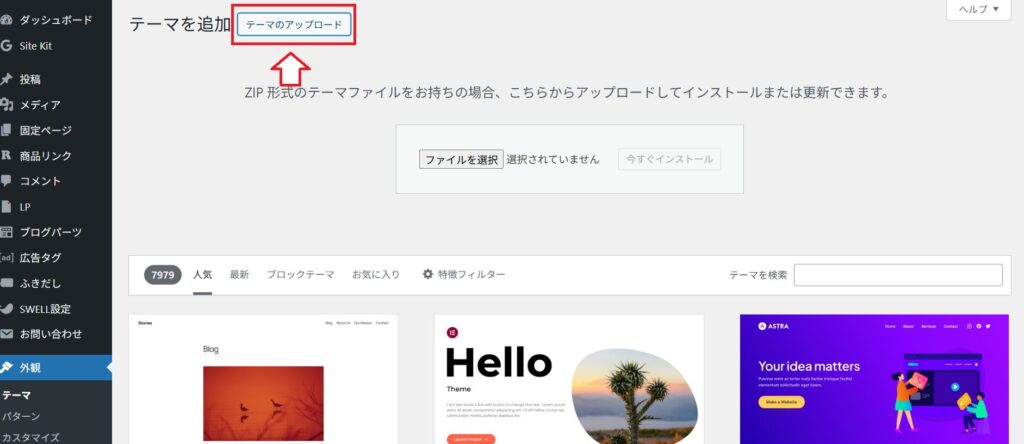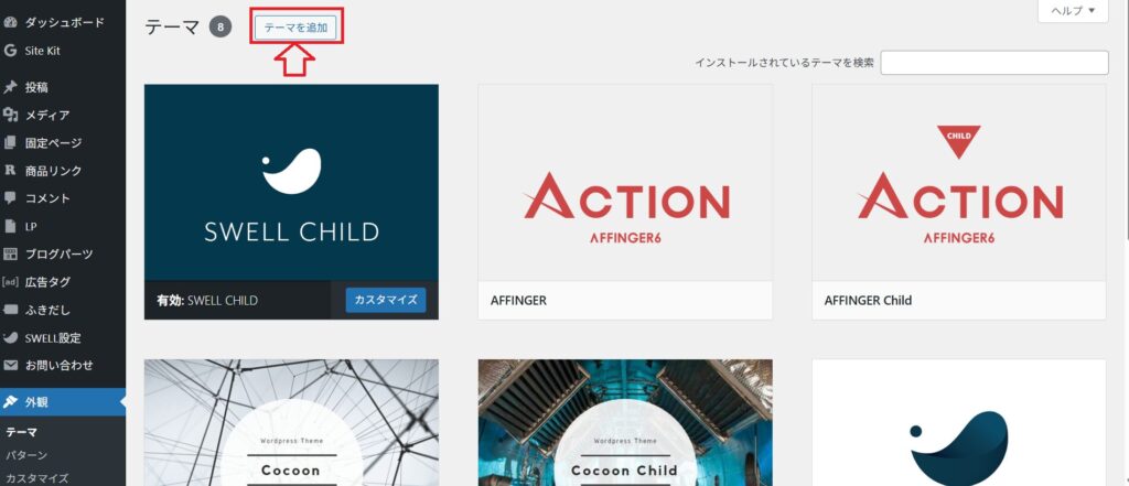 WordPressにSWELLを導入して使えるようにします、WordPress管理画面から外観をクリックして『テーマを追加』クリックしましょう
