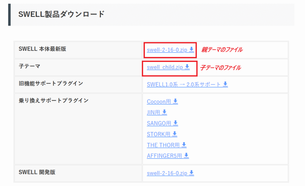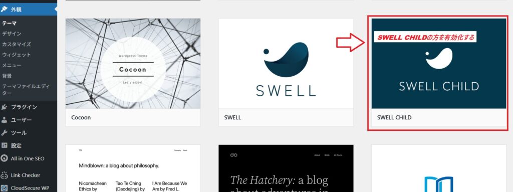 SWELLテーマに限らずCHILDの方を有効化します、本体の方はバックアップなどで必要なのでそのままでOK!
